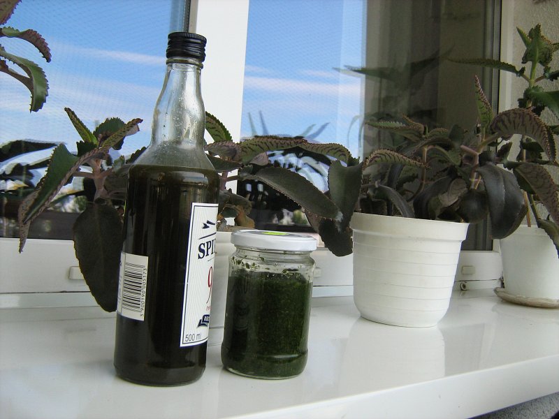 Полученное сырьё затем аккуратно измельчают, складывают в стеклянную или керамическую посуду и вливают водку в таком количестве, чтобы она покрыла содержимое, оставляют настаиваться в тёмном месте на 24 часа.