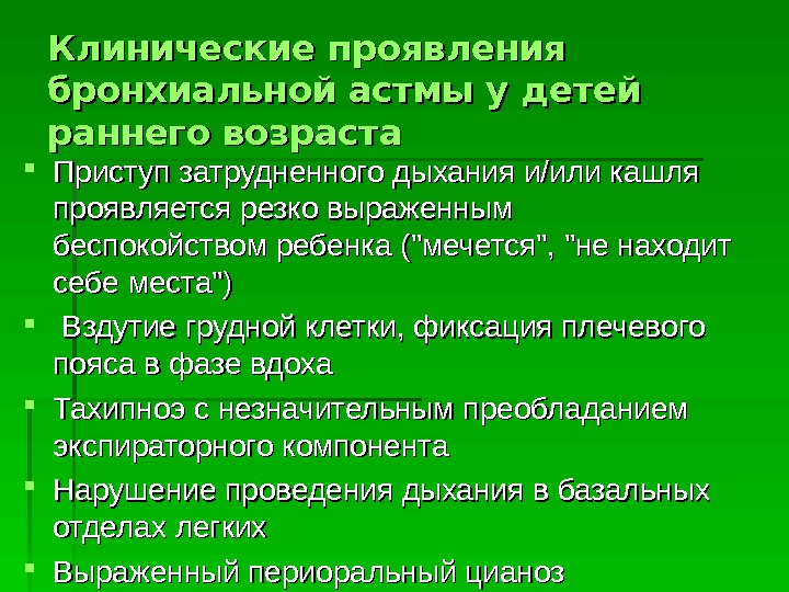 Первые признаки бронхиальной астмы у детей до года проявляются на 2-й день, когда кашель характеризуется приступами. К основным из них можно отнести: