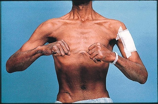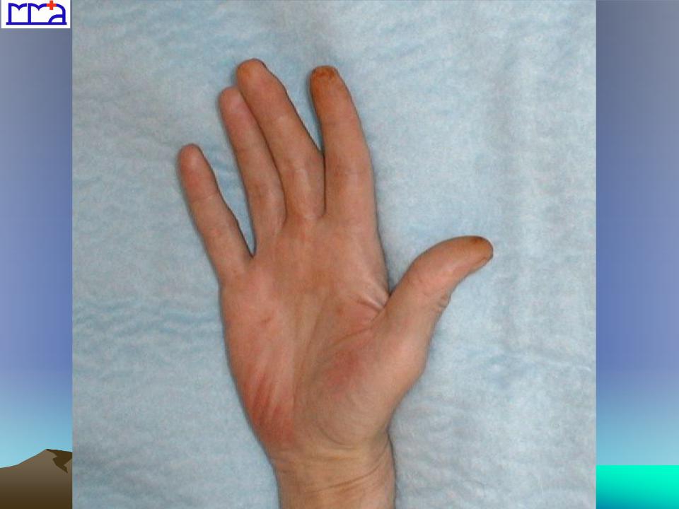 Ювенильная мышечная атрофия дистального отдела верхней конечности (JMADUE) или болезнь Хираямы была впервые описана в Японии в 1959 году. 120 Клинические критерии диагностики болезни Хираямы включают (1) постепенное начало преимущественно дистальной слабости и атрофии мышц предплечья и кисти; (2) появление симптомов в возрасте от 10 до 20 лет; (3) односторонне доминирующие симптомы и признаки; (4) постепенное прогрессирование в течение первых нескольких лет с последующей стабилизацией клинического течения; (5) отсутствие каких-либо значительных сенсорных изменений, аномальных рефлексов растяжения мышц или признаков Бабинского; (6) отсутствие симптомов со стороны нижних конечностей; и (7) исключение других заболеваний, включая опухоли спинного мозга, ювенильный БАС, сирингомиелию, мультифокальную моторную невропатию и полимиелит. 121,122 В основном задействованы внутренние мышцы кисти (межкостные, тенарные и гипотенарные группы мышц), а также локтевая сторона предплечья. Нет атрофии или слабости плечевой мышцы или двуглавой мышцы плеча. Это создает четко выраженную границу между атрофическими дистальными мышцами и хорошо сохранившейся брахиорадиалис, отсюда и термин «косая амиотрофия». Примерно в 15% случаев может быть небольшая атрофия трехглавой мышцы плеча, но в большинстве случаев атрофия и слабость в плечах отсутствуют. 122 Хотя это состояние имеет преимущественно одностороннее проявление (примерно 70%), примерно у 30% пациентов может быть выявлено двустороннее поражение верхних конечностей. Рефлексы растяжения мышц обычно сохранены на всех конечностях, а на нижних конечностях отсутствуют признаки пирамидного тракта. Следует отметить, что в холодных условиях наблюдается обострение мышечной слабости кисти. Также отмечается тонкий тремор пальцев в вытянутых руках и кистях.Фасцикуляции могут наблюдаться не только в первично пораженных мышцах, но и в неатрофических мышцах верхних конечностей. Хотя состояние может прогрессировать довольно быстро, в большинстве случаев наблюдается медленное прогрессирование после начала со стабилизацией симптомов и признаков примерно через 5 лет. Незначительное улучшение мышечной силы может быть отмечено после прекращения прогрессирования. 122