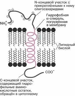Схема структурной организации интегрального белка. Спиральный участок встроен в гидрофобную часть липидного бислоя; N-концевой участок с прикреплёнными к нему олигосахаридными цепями расположен на вне…
