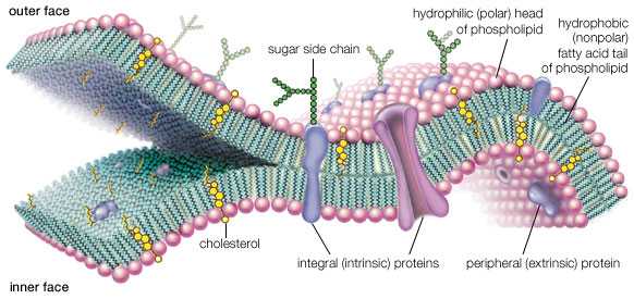 В структуре мембраны согласно жидкостно-мозаичной модели имеется двойной липидный слой, покрытый периферическими белками, кроме того в него погружаются полностью или частично интегральные белки. Эти белки имеют двойственную природу, причем спиральные участки, пронизывающие липидный слой, состоят из алифатических (липофильных) аминокислот, в то время как их наружные концы гидрофильны и могут быть связаны с остатками сахаров.
