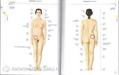 Справа, в поясничной области проецируются органы брюшной полости, а именно: правая почка, кишечник, желчный пузырь, печень, у женщин – правый яичник.