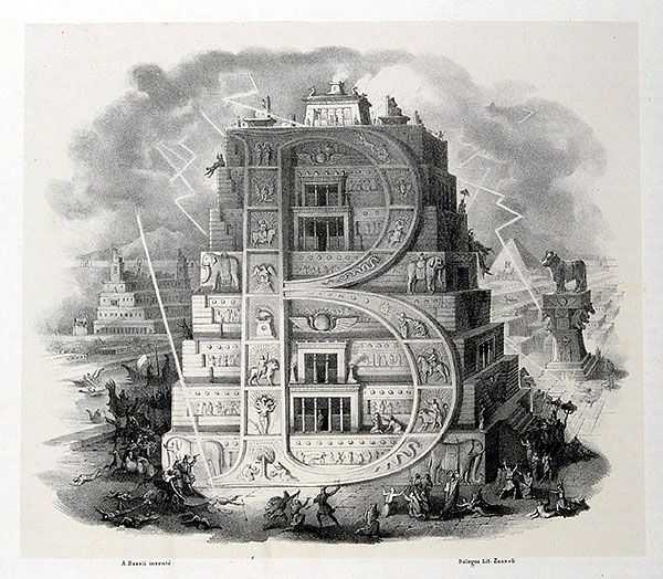 Джон Лич, буквица «T» из книги Gilbert Abbott A. Beckett, Comic History of Rome, Bradbury, Evans & Co, London, c. 1850, p. 56.