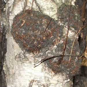 | Споры чаги, рассеянные в воздухе проникают в сердцевину живой березы через поврежденные участки коры живой берёзы (морозобоины, обломанные сучья) прорастают там, образуя мицелий, питающийся соком березы. | Нити мицелия проникают в древесину, постепенно разрушая её, вызывают белую сердцевинную «гниль». Одновременно под корой (в местах первоначального проникновения спор) образуется плодовое тело, дающее базидиоспоры | На 4-й год грибница выходит наружу и начинает развиваться бесплодный мицелий, образуя на коре медленно растущие бесформенные чёрные наросты. Первые следы того,что мы называем Чага | Массивный нарост чаги появился на стволе (рис.4). Береза будет стараться сбросить его в течении своей жизни, но как правило этого не происходит. Чага будет жить на этой березе до 20 лет и более, или пока береза не погибнет |