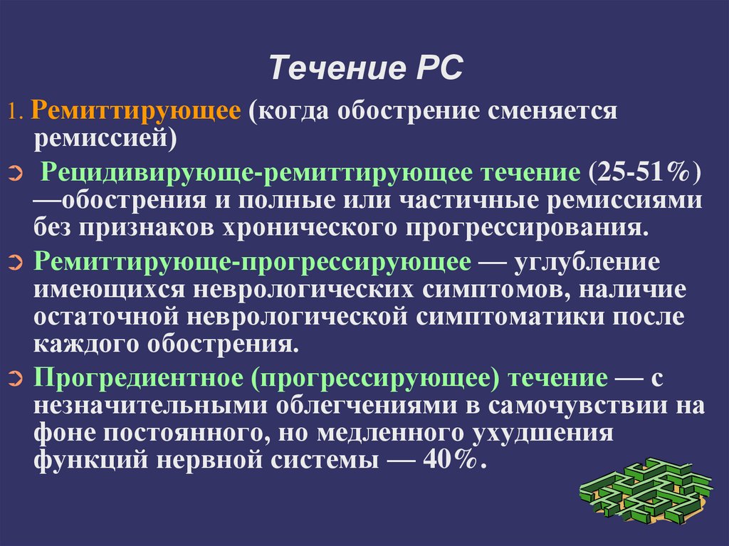 Как отмечалось ранее, приблизительно 80% случаев рассеянного склероза начинаются как рецидивирующее состояние.