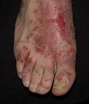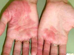 При заболевании тело больного покрывается красными пятнами с пузырьками. В зависимости от вида экземы, очаговые покраснения могут шелушиться либо, наоборот, постоянно оставаться мокрыми. Пораженные места могут распространяться по всему телу: на ногах, руках, ладонях, пальцах, лице.
