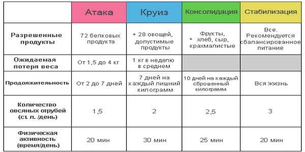 Поделена диета Дюкана на несколько этапов, каждый из которых отвечает за осуществление определенных процессов в организме, влекущих за собой потерю лишних килограмм у худеющих, исходя из отзывов врачей.
