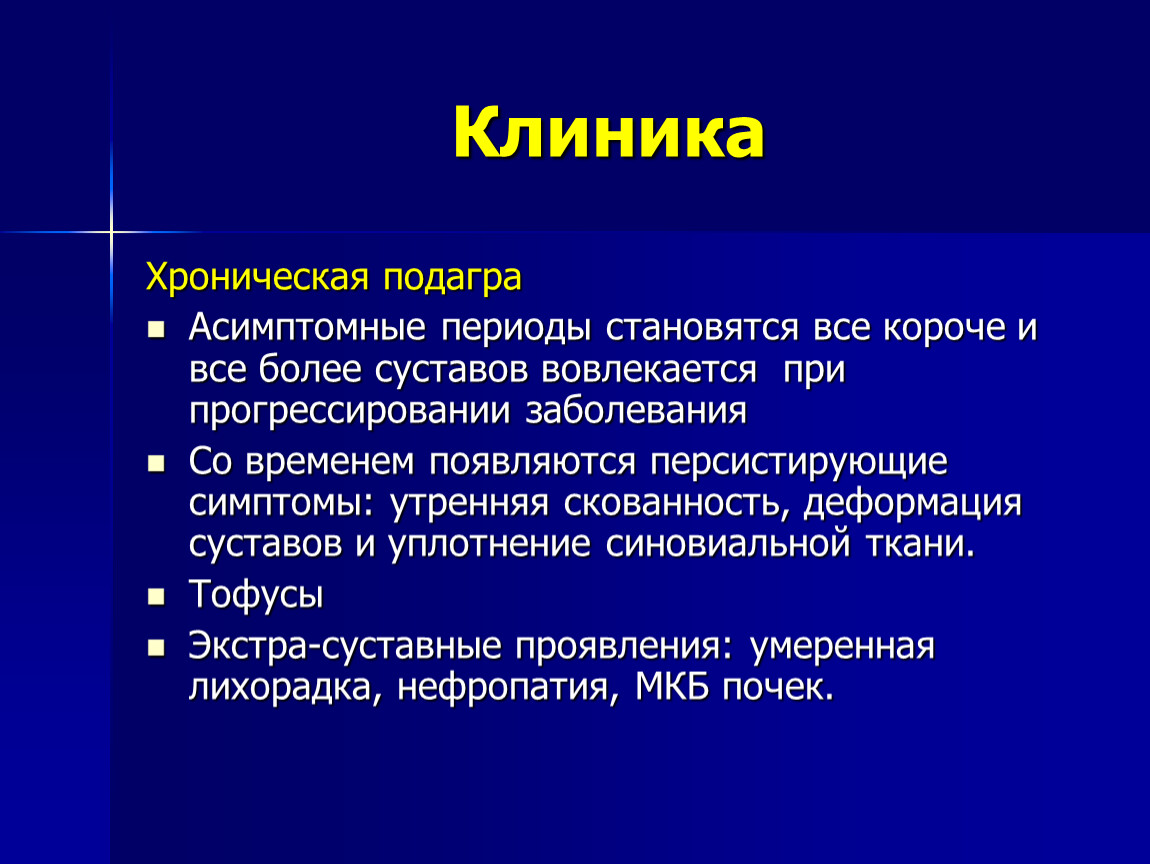 Один из признаков обострения подагры — это приступы острого артрита. Развиваются такие приступы внезапно. За два-три дня до приступа возможно появление озноба, субфебрильной температуры, диспепсических расстройств, общей раздражительности. Во время приступа чаще всего поражается плюснефаланговый сустав первого пальца стопы. Появляется и быстро нарастает боль, сустав отекает, кожа над ним краснеет, повышается температура в области сустава. Боль усиливается от любых прикосновений, даже от прикасания больного сустава к одеялу.