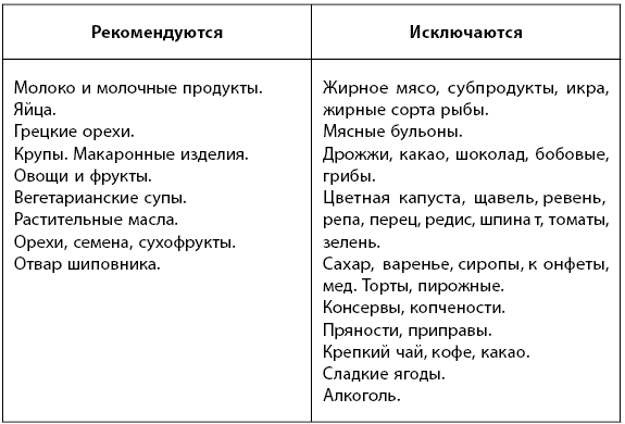 В период обострения заболевания нужно перейти практически на вегетарианскую диету. Необходимо полностью исключить из рациона все мясные и рыбные блюла. Можно есть жидкие молочные каши, овощные супы, фрукты и ягоды. Соблюдать питьевой режим. В сутки надо выпивать около 1,5 литров воды. Можно пить щелочную минеральную воду.