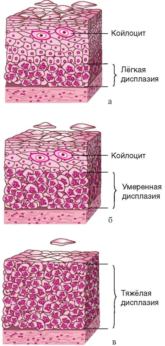 Как уже было сказано, во влагалищной части шейки матки образуется граница между плоским цилиндрическим эпителием, богатым железами, и многослойным эпителием. При дисплазии округлые одноядерные клетки превращаются в бесформенные многоядерные эпителиоциты. Кроме того, происходит нарушение послойного строения тканей. Врачи классифицируют стадии дисплазии в зависимости от глубины клеточной деформации.