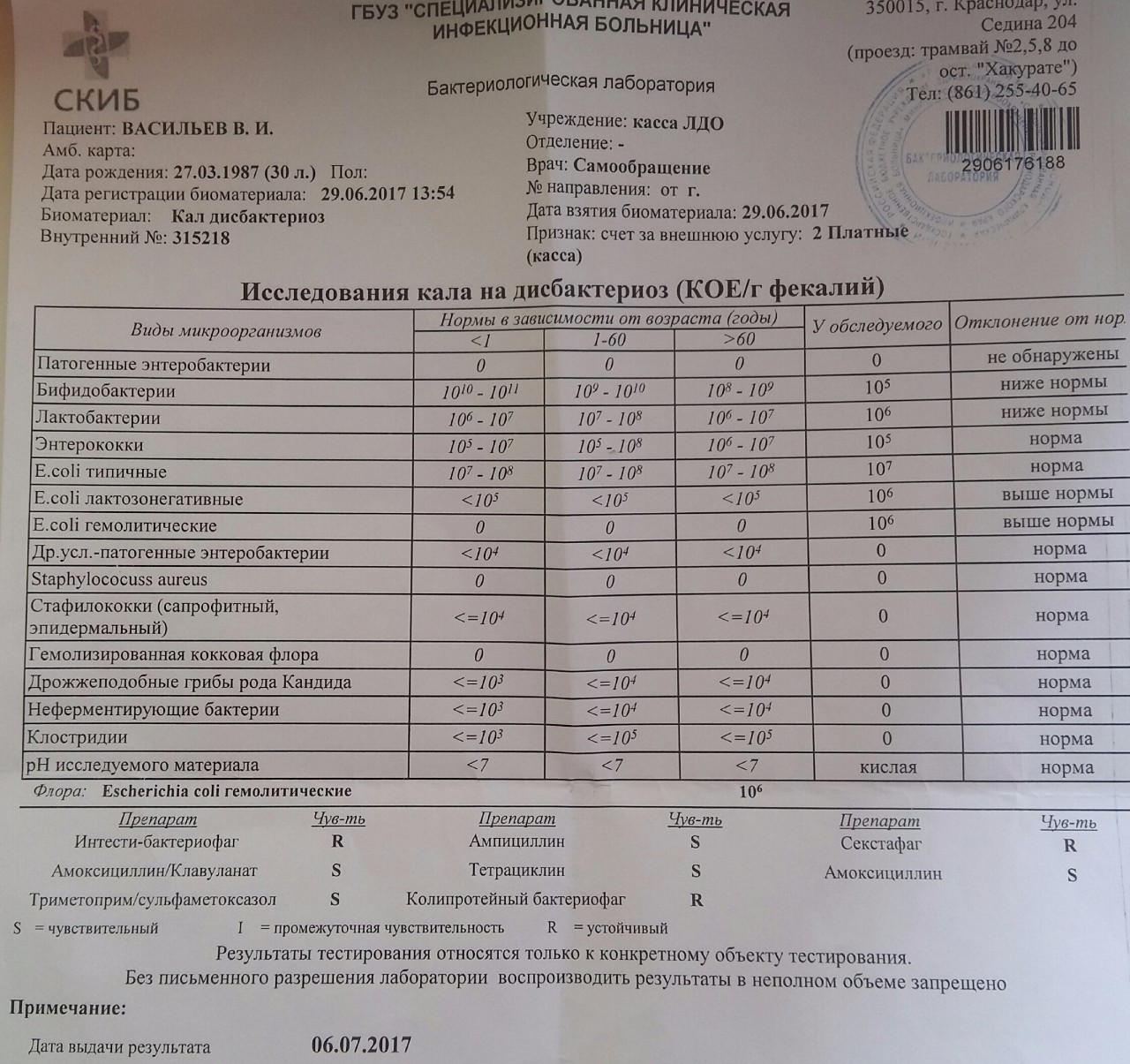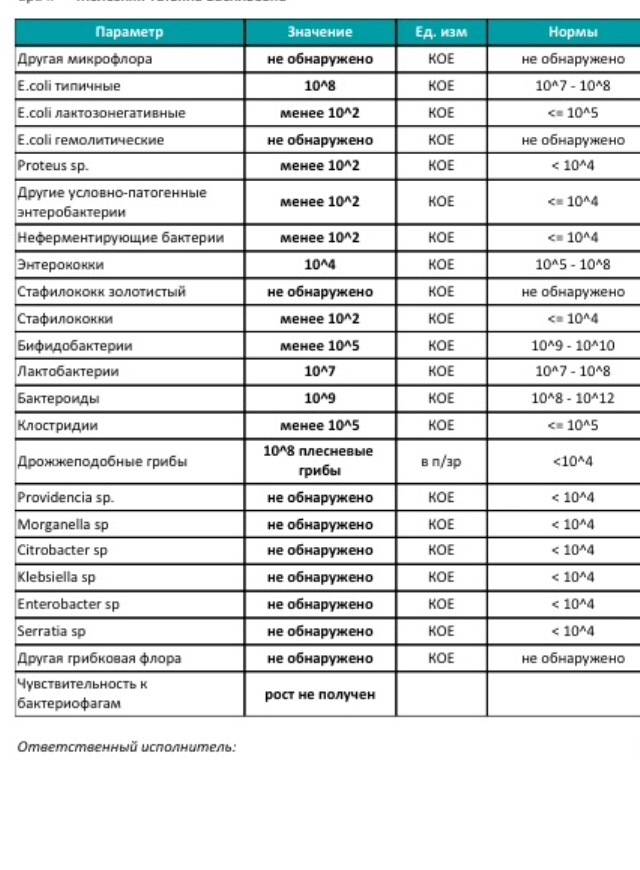Допустимо присутствие до 104. Повышение этого параметра может быть после применения антибиотиков. Если количество грибов повышено, а количество нормальной кишечной флоры резко снижено, при этом отмечается кандидоз (молочница) видимых слизистых оболочек (ротовая полость, половые органы) – это проявления системного кандидоза, то есть имеется инфицирование грибами кишечника.