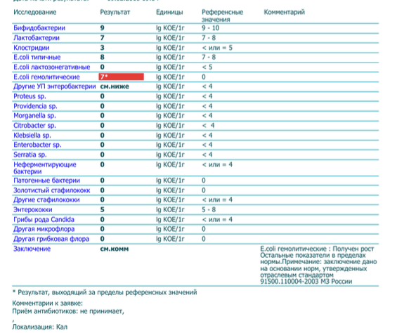 В норме должна отсутствовать. Она может вызывать аллергические и кишечные проблемы, очень распространена в окружающей среде (правда, практически никогда не встречается в грудном молоке), вызывает проблемы у ослабленных детей, требует иммунокоррекции. Следует отметить, что термин «гемолизирующая» не означает, что имеется какое-то влияние на кровь. Условно-патогенная флора при дисбактериозе не должна преодолевать кишечную стенку и попадать в кровь. Это возможно только при крайне выраженных формах дисбактериоза у детей с выраженными иммунодефицитами, как правило, представляющих угрозу для жизни. К счастью, такие состояния встречаются нечасто.