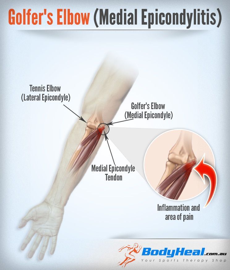 Локоть гольфиста или медиальный эпикондилит аналогичен своему аналогу, теннисному локтю или латеральному эпикондилиту. Основные различия между этими состояниями заключаются в локализации боли и активности, которая приводит к травме. Оба состояния вызваны чрезмерной нагрузкой на мышцы и сухожилия предплечья, что приводит к воспалению и боли в локтевом суставе.Обе эти проблемы являются формами тендинита. Люди, страдающие от локтя игрока в гольф (медиальный эпикондилит), часто занимаются ракетками или гольфом. Боль в локте гольфиста обычно возникает в локтевом суставе с внутренней стороны руки. Обычно при захвате предметов возникает стреляющая боль в предплечье. Пациенты с теннисным локтем (латеральный эпикондилит) испытывают боль с внешней стороны локтя, которая усиливается при захвате предметов и отведении запястья назад. Эта травма распространена среди тех, кто много занимается теннисом или ракетками, отсюда и название «теннисный локоть».Однако любое действие, связанное с повторяющимся поворотом запястья, может привести к этому состоянию. Лечение редко бывает хирургическим, так как оба этих состояния хорошо поддаются лечению с помощью небольшого отдыха и надлежащей реабилитации.