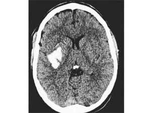 С точностью распознать геморрагический инсульт помогают информативные спиральная (СКТ) или мультиспиральная (МСКТ). Суть её заключается в послойных рентгеновских снимках головного мозга, на которых кровоизлияние достаточно хорошо видно см. рисунок.