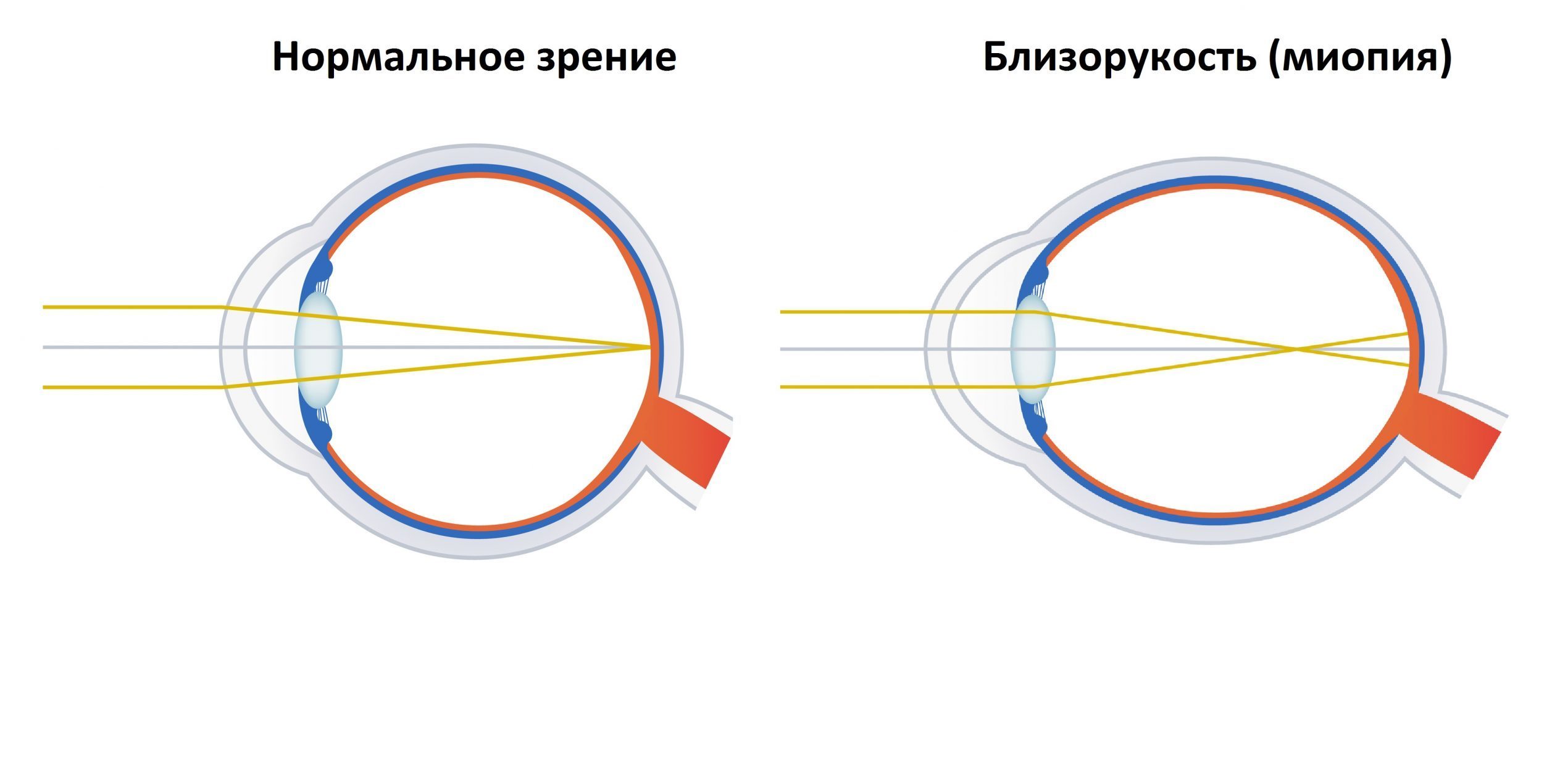 В случае миопии или близорукости оптическая сила глаза более высокая и не соответствует аксиальной длине глазного яблока. Идущие паралельно лучи света фокусируются перед сетчаткой, поэтому на сетчатке изображение образуется размытое. Чаще всего близорукость образуется из-за того, что глаз вытягивается, и тем самым аксиальная длина глаза увеличивается. Реже близорукость появляется по причине более выпуклой роговицы. Чем больше изгиб роговицы, тем больше ее оптическая сила, и поэтому фокусировка лучей происходит перед сетчаткой.