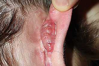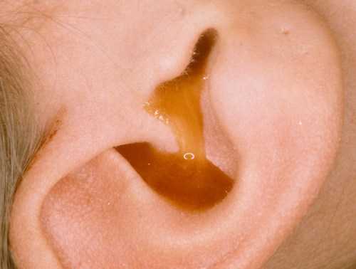Больное ухо у взрослого человека в период болезни выглядит отекшим и может иметь покрасневшие участки кожи. При гноетечении из слухового прохода выделяется вязкая жидкость с неприятным запахом и желтоватым оттенком. Образующиеся корочки могут вызывать раздражение, но если пытаться их очистить механически, есть вероятность повреждения наружного уха и распространения воспаление.