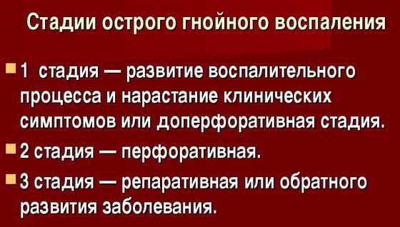 В зависимости от того какие признаки наблюдаются у больного, различают три основные стадии гнойного отита: