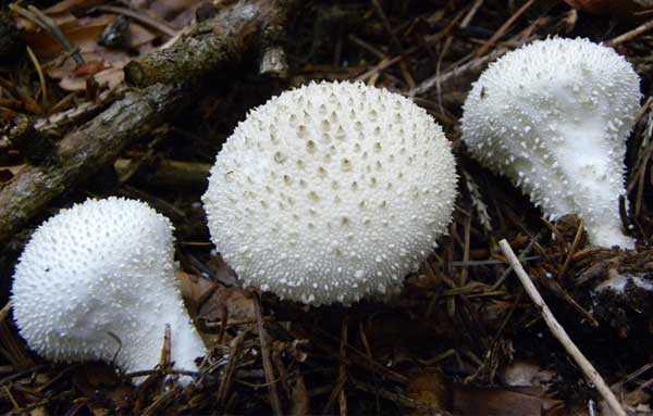 Этот представитель грибного царства знаком многим с детства. Вспомните – это тот самый гриб дождевик съедобный (шиповатый), что при повреждении издает смешной звук и выделяет массу сероватой пыли. Однако так себя «ведут» только зрелые плодовые тела, молодые же, напротив, белые и симпатичные.
