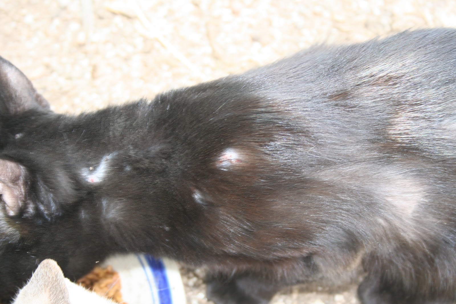 Когда споры гриба попадают на какую-либо часть тела кошки, то все тело подвергается воздействию. В основном первые признаки заболевания проявляются как красная сыпь на ушах, морде и по всему телу. На следующем этапе развития заболевания начинает выпадать шерсть, появляются залысины (отсуда и название стригущий лишай). Сильный зуд вызывает у животного раздражительность, беспокойство, дискомфорт, у него пропадает аппетит. Болезнь развивается очень быстро и за несколько дней тело кошки покрывается красными пятнами.