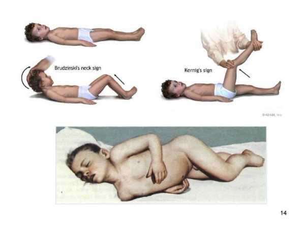 - Напряжение мышц задней поверхности бедер – разогнуть ноги ребенка, согнутые в тазобедренном и коленном суставе, в случае менингита не получится;