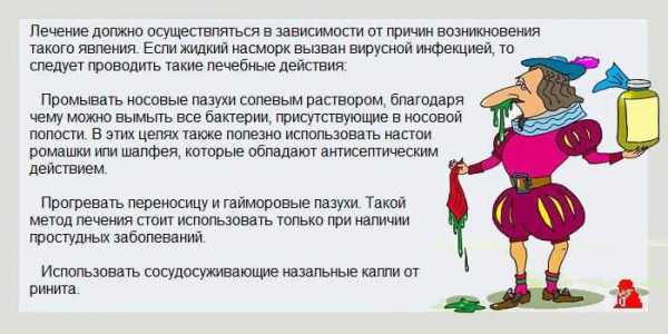 Методика лечения жидкого насморка, в первую очередь, зависит от причин, его вызвавших. В любом случае нужно понимать, что насморк сам по себе болезнью не является, это только одно из проявлений более серьезного заболевания, поэтому лучше посетить врача и придерживаться его рекомендаций по борьбе с патологией.