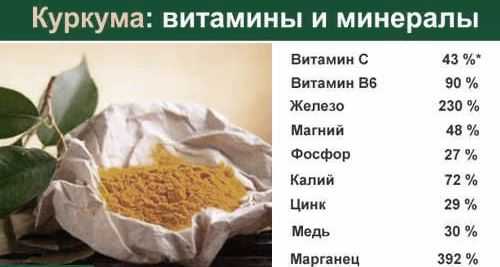 Помимо этого, куркума богата витаминами В, кальцием, марганцем, магнием, калием, железом, фосфором и другим важными для нормальной жизнедеятельности организма микроэлементами. Они справляются с большинством известных заболеваний, которые часто встречаются у пациентов.