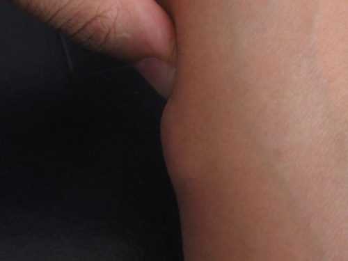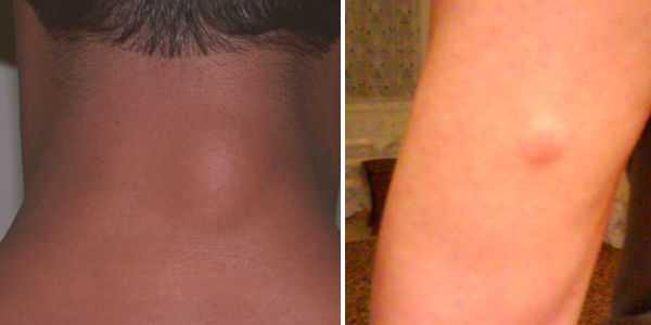 На фото видно, что опухоль располагается непосредственно под кожей, в центре немного желтоватая, хотя в целом не отличается по цвету от эпидермиса.