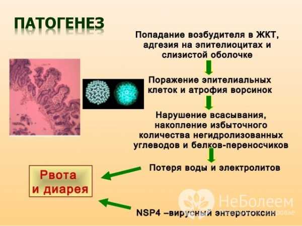 Репликация ротавирусов в организме происходит преимущественно в энтероцитах ворсинок тонкого кишечника, что приводит к гибели последних и последующим структурным и функциональным изменениям эпителия. Вирус проникает в клетку прямой пенетрацией через клеточную мембрану или путем эндоцитоза. Вследствие нарушения процесса пищеварения и скопления дисахаридов в просвет кишечника поступает большое количество воды и электролитов, что приводит к развитию сильной диареи и обезвоживания организма.