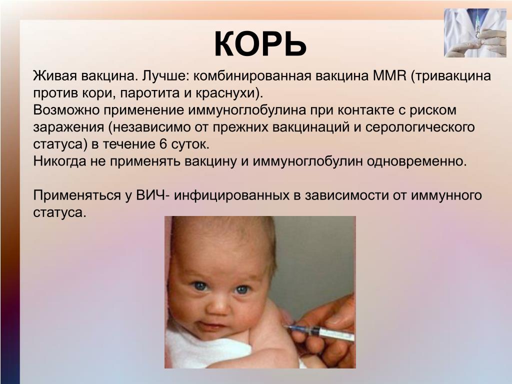 Вакцина — это лекарство, которое предотвращает заражение конкретным заболеванием. Вакцина MMR (корь, свинка, краснуха) защищает людей от всех этих трех инфекций (комбинированная вакцина). Врачи могут вакцинировать против ветрянки одновременно, смешивая вакцину против ветрянки (ветряная оспа) с вакциной MMR (MMRV) или давая ее отдельно в одно и то же время (MMR+V).