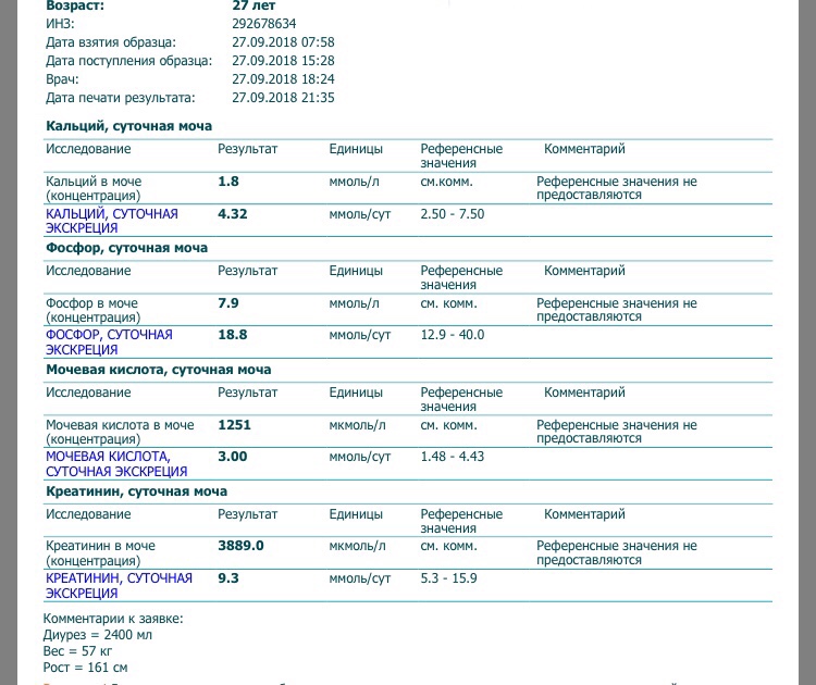 Измерения осмоляльности проводились на приборе Station 6060 TT (Array Global Business Inc., Япония), а все остальные биохимические анализы выполнялись на системе Cobas 8000/ISE Modul (Roche Diagnostics, Базель, Швейцария) в сертифицированной лаборатории клинической химии Университета Больница Берн.Удельный вес мочи определяли с помощью цифрового фотометрического рефрактометра с шагом 0,005 на основе коэффициента отражения света, направленного на полоски, смоченные мочой (Uricon-Ne, Atago CO, LTD, Токио, Япония).