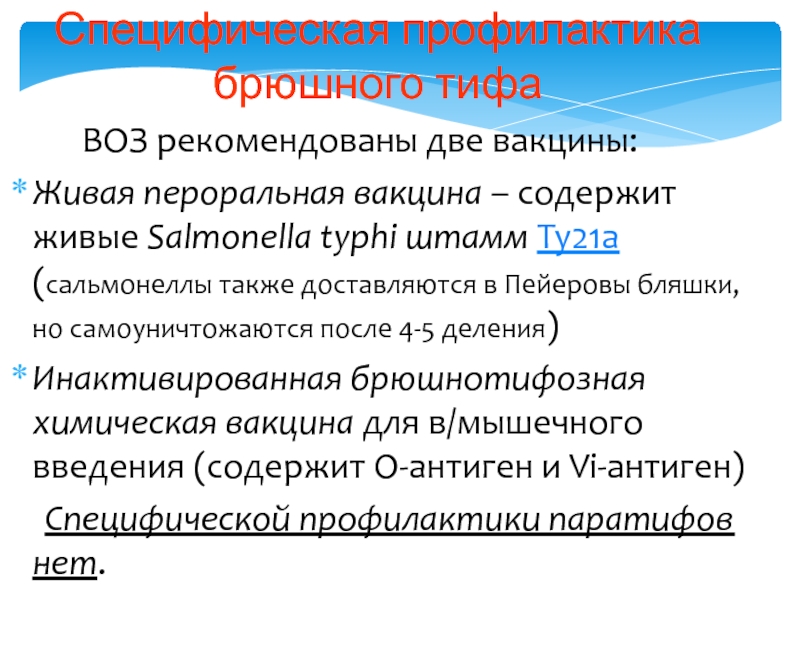 Профилактика и противоэпидемические мероприятия. Мероприятия по борьбе с тифопаратифозными заболеваниями направлены на выявление источников инфекции, пресечение путей передачи, повышение невосприимчивости организма.