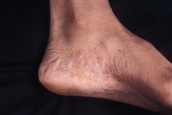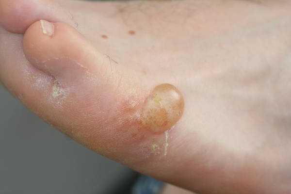 Везикулярная форма представляет собой гроздья пузырей на ноге, покрытых толстой крышкой рогового слоя. После лопания пузыри оставляют некрасивые язвенные поражения, диагностировать явление по итогу сложно, поскольку дифференциация может проводиться с «букетом» кожных болезней – псориазом, дерматитами, экземой. Усугубляют картину бактериальные организмы, то и дело проникающие в язвы.