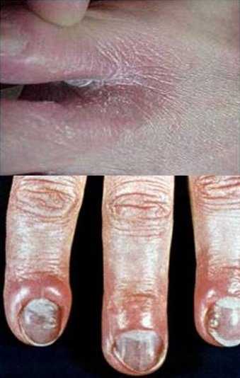 При этом кожа обретает грубое и чрезмерно сухое покрытие, безумно чешется и шелушится. На пластинах могут образовываться пятнышки желтоватого или белого типа оттенка, они собою захватывают всю ногтевую и ручную площадь.