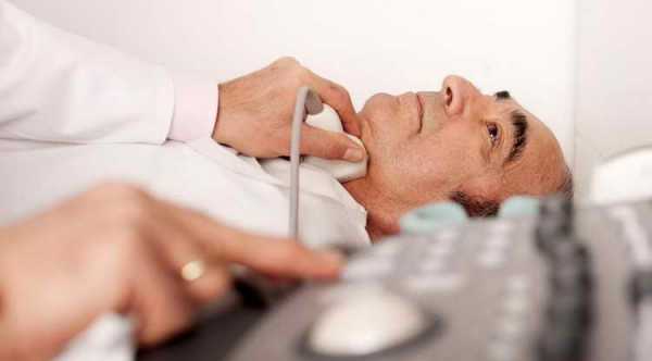 Врач осматривает шею пациента, визуально определяя ее контуры, наличие деформации в области расположения щитовидки. Затем доктор приступает к пальпации ткани железы.