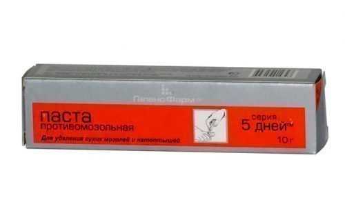 - Паста 5 дней. Это средство обладает размягчающим и увлажняющим действием. Его наносят на проблемный участок на 12 часов. После того, как активные компоненты проникнут вглубь нароста, его можно очистить при помощи пемзы. Пользоваться пастой можно несколько раз, пока проблема не будет решена. Лечение мозолей с помощью такого средства проходит очень быстро.