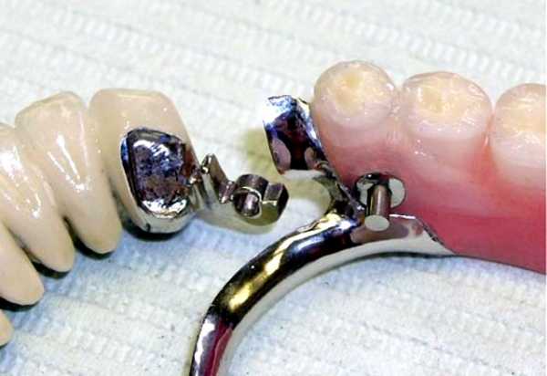 - Замковый тип фиксации. Прикрепление протеза к зубам при помощи замочков (аттачменов). Одна из частей замочка прикрепляется к опорному зуба, другая – установлена на конструкции. При взаимодействии обе части замочка защелкиваются. При данной технологии протезирования приходится препарировать опорные зубы, чтобы вставить в них замки.