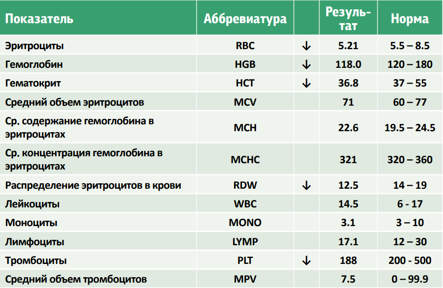 | 10 суток | 180 (160-190) | 5,0 (4,5-5,5) | 1,2 | 34 | 49 | 5 (0-15) |