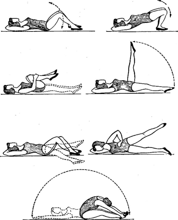 - Обе ноги следует согнуть в коленях, при этом таз необходимо приподнять с опорой тела на ноги, затылочную область головы и локти (повторить необходимо 5 раз).