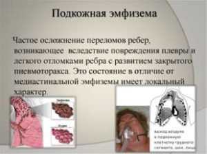 В результате повреждения легкого может развиваться также подкожная эмфизема, которая характеризуется попаданием воздуха в подкожно-жировую клетчатку.