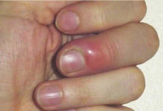 Панариций выглядит как покраснение, утолщение некоторых пальцев в области ногтей