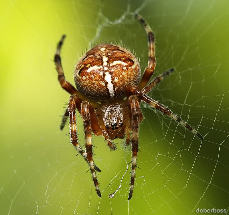 Некоторые волоски на теле членистоногого способны реагировать на наличие раздражителей химического типа, другими волосками воспринимаются воздушные колебания, а третьими – улавливаются всевозможные окружающие звуки.Брюшко пауков-крестовиков округлой формы и полностью лишено сегментов. В верхней части располагается рисунок в виде креста, а на нижней – присутствует три пары специальных паутинных бородавок, в которых содержится почти тысяча желез, производящих паутинные нити. Такие прочные нити имеют различное назначение: строительство надежных ловчих сетей, обустройство защитных укрытий или плетение кокона для потомства.