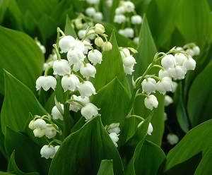 - Ландыш майский. Особенно распространен в Испании, Португалии, Германии, Италии, Греции, Польше, Украине, Белоруси. Также он встречается в России и Закавказье. В природе встречается во всех типах лесов. Прикорневые листы продолговатой формы, заостренные на концах. Стебель достигает максимальной высоты в 30 см. Соцветие состоит из небольших цветов, которые по виду напоминают колокольчики. Количество цветочков на стебле доходит до 20 штук, они белого или розоватого цвета.