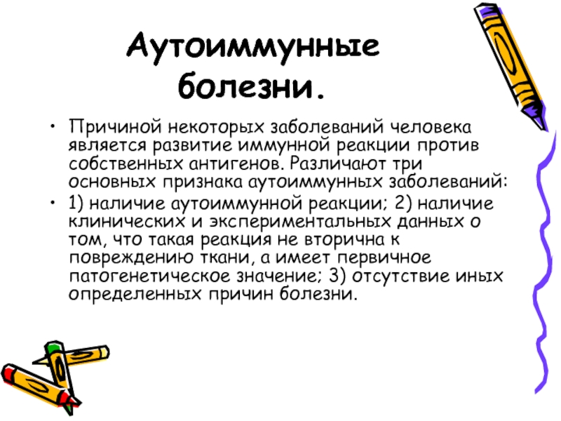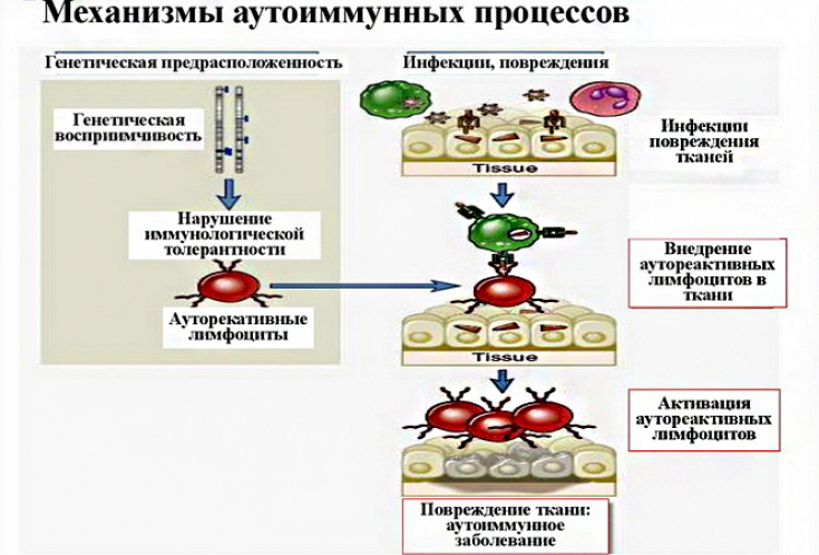 Аутоиммунное заболевание возникает, когда иммунная система атакует собственные молекулы в результате нарушения иммунологической толерантности к аутореактивным иммунным клеткам.Многие аутоиммунные заболевания тесно связаны с генетическими, инфекционными и/или предрасполагающими факторами окружающей среды. Аутоиммунные заболевания, включающие множественные расстройства и симптомы, варьирующие от органоспецифических до системных, включают инсулинозависимый сахарный диабет, ревматоидный артрит, системную красную волчанку, склеродермию, тиреоидит и рассеянный склероз.