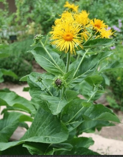 Inula helenium — это высокое травянистое многолетнее растение (зона 3) с жестким опушенным стеблем.Относительно небольшие соцветия, похожие на подсолнечник, покрывают стебли высотой 3-6 футов и цветут с мая по август. У крупных листьев зубчатые края и опушенный или щетинистый покров. Более мелкие листья ближе к верхушке растения имеют форму сердца и обхватывают стебель.