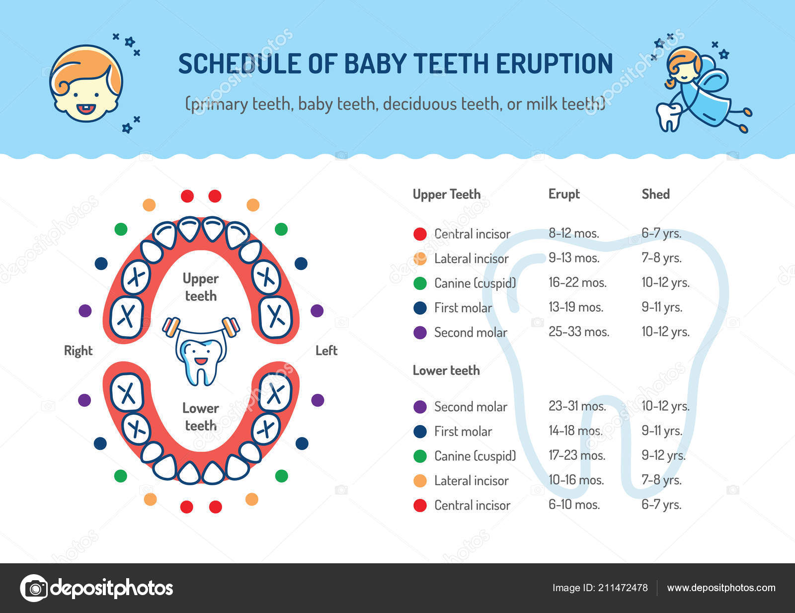 Прорезывание зубов — это процесс прорезывания молочных зубов (также известных как молочные или молочные зубы). Прорезывание зубов обычно начинается примерно в возрасте 3-6 месяцев, но это сильно различается у разных детей. У большинства детей первые зубы появляются в возрасте от 6 до 12 месяцев, но у некоторых зубы начинают прорезываться только в возрасте двенадцати месяцев.