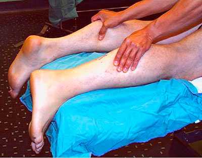 Пациент укладывается на живот, чтобы стопы свободно свисали с края кушетки, после чего врач сдавливает икроножные мышцы. Если целостность сухожилия не нарушена, стопа будет подниматься [подошвенное сгибание]. Если есть разрыв сухожилия, движений не будет.