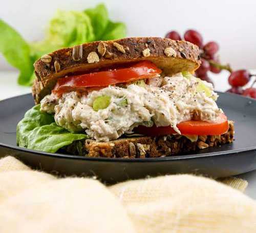 Смешайте обезжиренный йогурт, лимонный сок, соль, перец. Сельдерей нарежьте маленькими кусочками, также измельчите куриную грудку. Смешайте сельдерей и грудку с полученным ранее соусом. Между двух ломтиков злакового хлеба положите салат, ломтики помидора и полученную массу. Оставьте бутерброд на 1 час в холодильнике, чтобы ингредиенты пропитались ароматом друг друга.