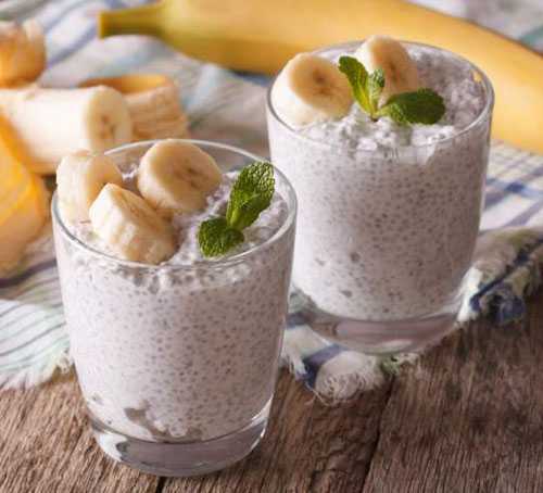 Разомните ложкой банан в равных пропорциях на 2 стакана. Добавьте в стакан семена чиа, кокосовое молоко, ваниль и корицу. Перемешайте все до однородного состояния. Оставьте в холодильнике на 4 часа. Такой завтрак можно готовить с ночи. Украсьте блюдо кусочками бананов и лепестком мяты.