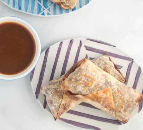 Разогреть духовку до 300 градусов. Нагрейте кунжутное масло на сковороде на среднем огне. Добавьте лук и обжаривайте 3-5 минут. Добавить в сковороду с луком чеснок, имбирь и обжаривайте еще 1 минуту. После добавьте капусту, морковь и грибы. Обжаривайте еще 3-5 минут до мягкости. Добавьте соевый соус в сковороду. Полученною смесь равномерно выложите в листы лаваша и сверните их. Выпекайте в течение 12-15 минут до золотистой корочки.