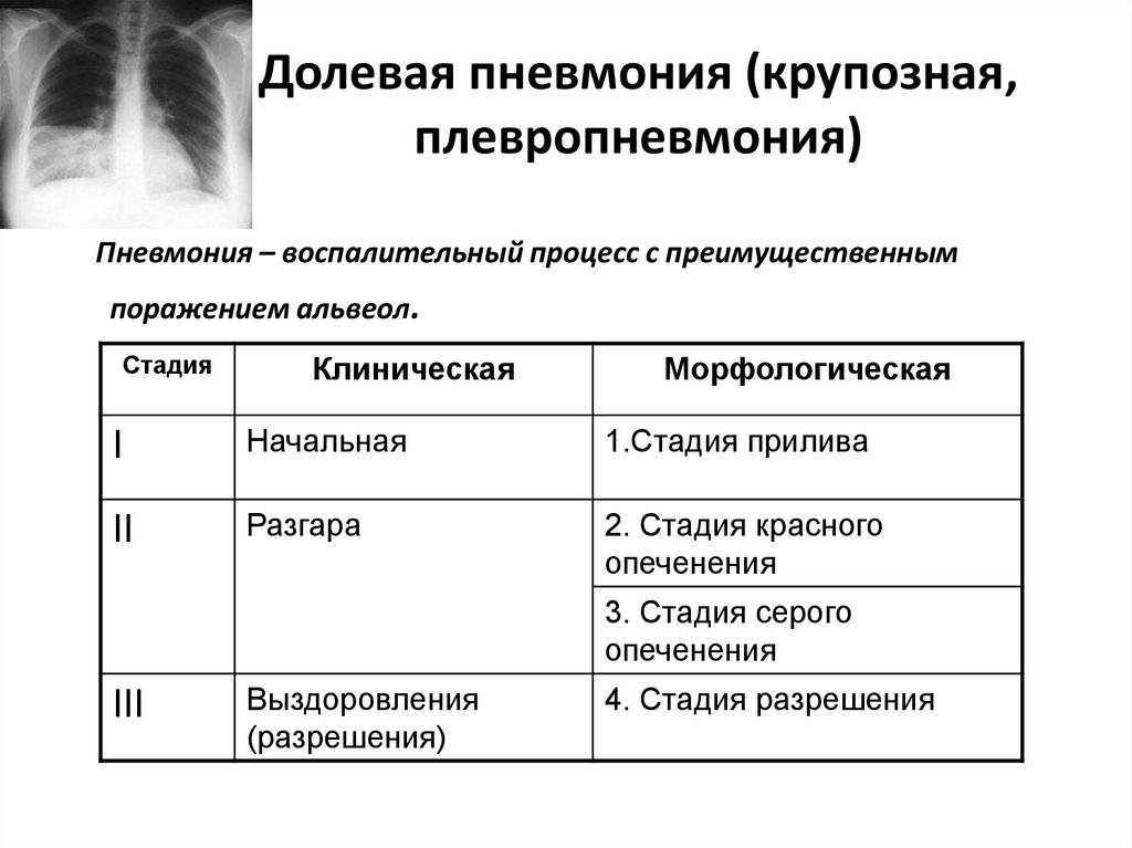 - Долевая пневмония — это воспаление легкого инфекционного характера, которое характеризуется вовлечением в процесс одной или нескольких долей легкого, с покрывающей их плеврой. Клиническая картина проявляется выраженной интоксикацией, интенсивным кашлем, одышкой с тахипноэ и тахикардией.